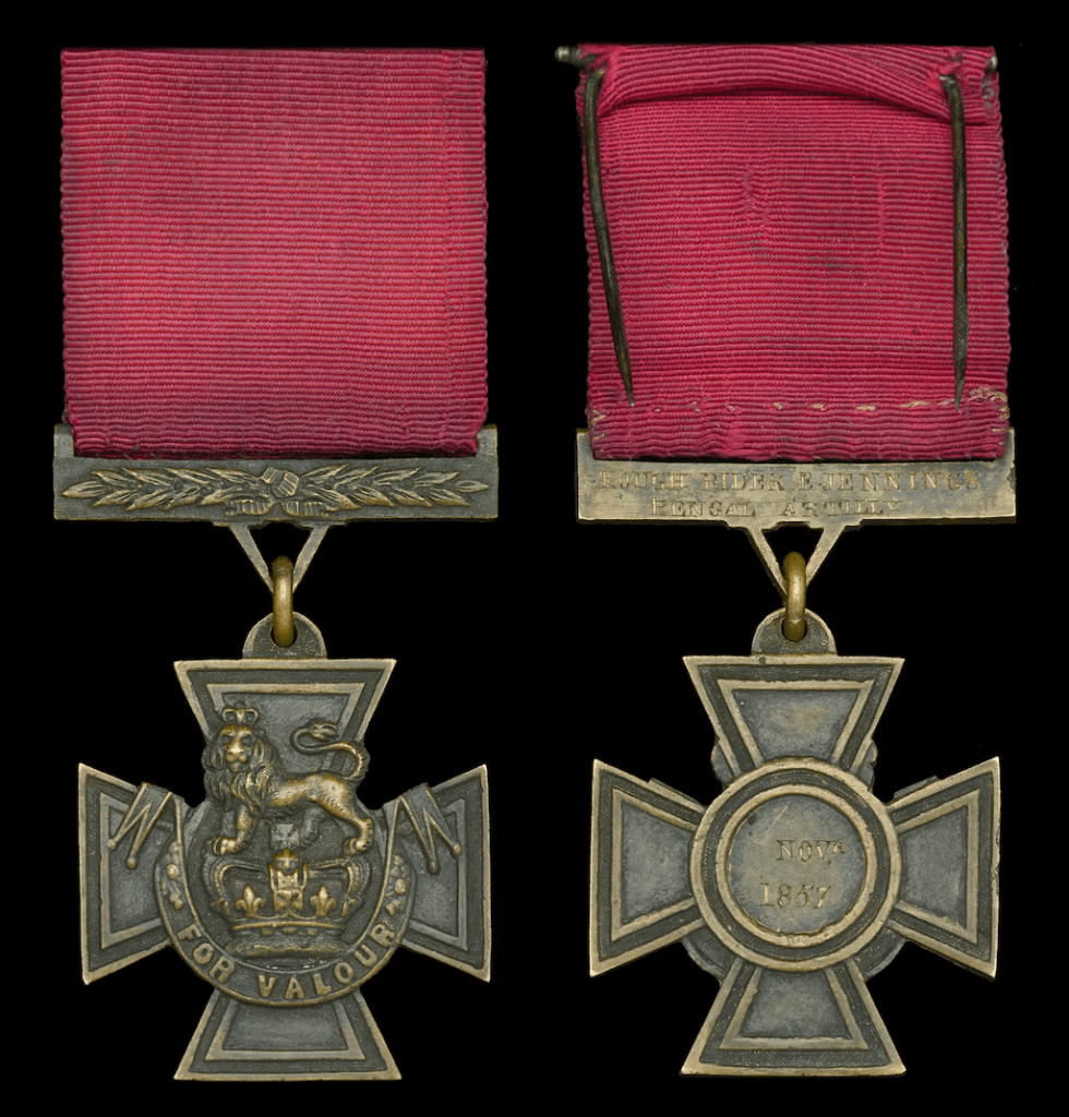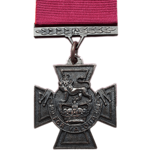 The VC is a bronze cross pattée, bearing the crown of Saint Edward surmounted by a lion, and the inscription “For Valour”. On the reverse of the medal is a circular panel on which the date of the act for which it was awarded is engraved in the centre. The reverse of the suspension bar is engraved with the recipient’s name, rank, number and unit along with the date of the act of valour.