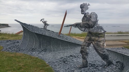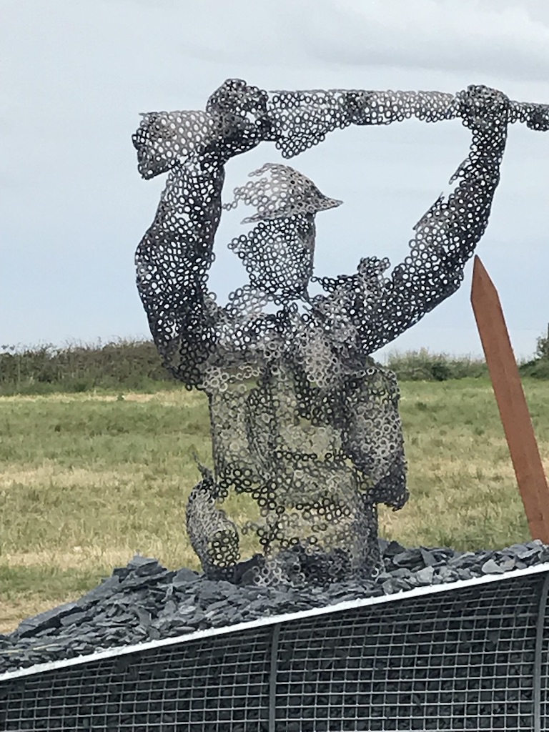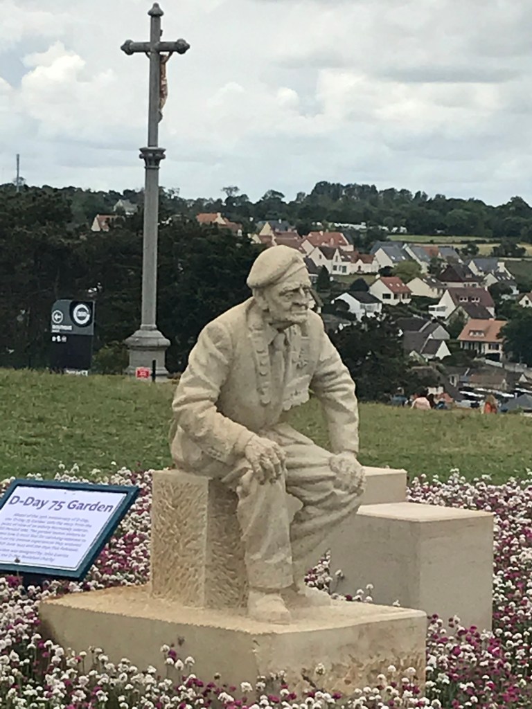 While wandering through the museum, I came upon the statue of an elderly British veteran, Bill Pendrell, MM. He was sitting in quiet contemplation, overlooking the beach at Arromanches. This was where he had landed 75 years earlier. I saw the struggle in Bill’s eyes. He was trying to remember the events of that day. Looking around, I saw several other statues in the garden. created by the artist, John Everiss. They seemed to reconstruct Bill’s fading memories, leaving a hollowed out shell.