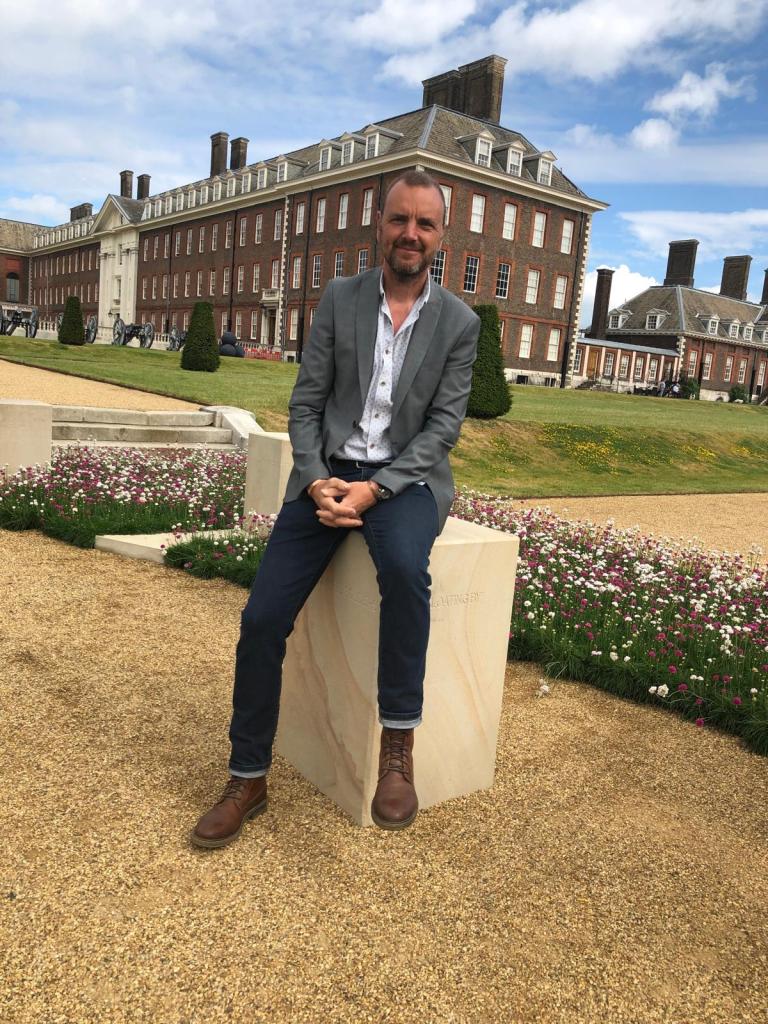 “Sitting on a block at the Chelsea Flower Show. Each block had a quote from a D-Day veteran carved around the top. The one that sticks in my memory is-