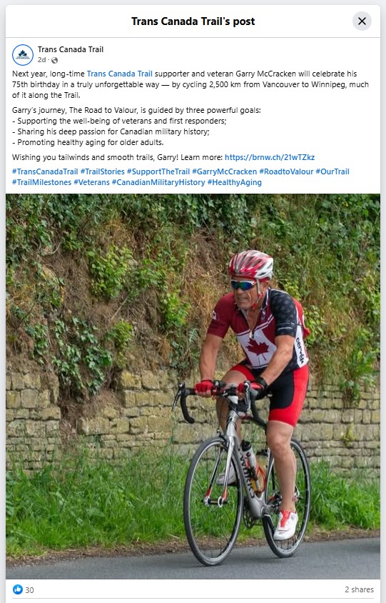 I’m thrilled to share that Trans Canada Trail—the organization behind the world’s longest recreational trail—has taken note of The Road To Valour, my upcoming 2,500 km bike journey in support of mental health for veterans and first responders. In a recent social media posting, Trans Canada Trail posted a very positive note of support for The Road To Valour.