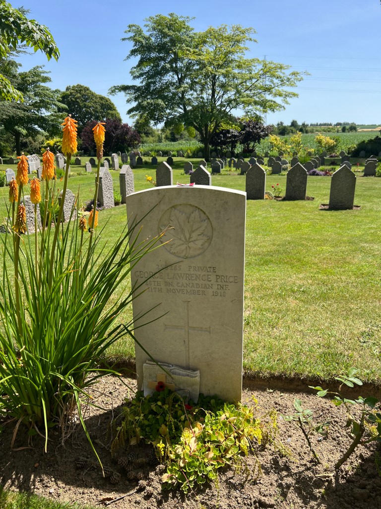 In a military cemetery, shared by British, Canadian and German soldiers, near Mons are buried the first British casualty of the war, Private J. Parr of the Middlesex Regiment and the last Canadian casualty of the war, Private George Price of the 38th Battalion, Canadian Infantry.